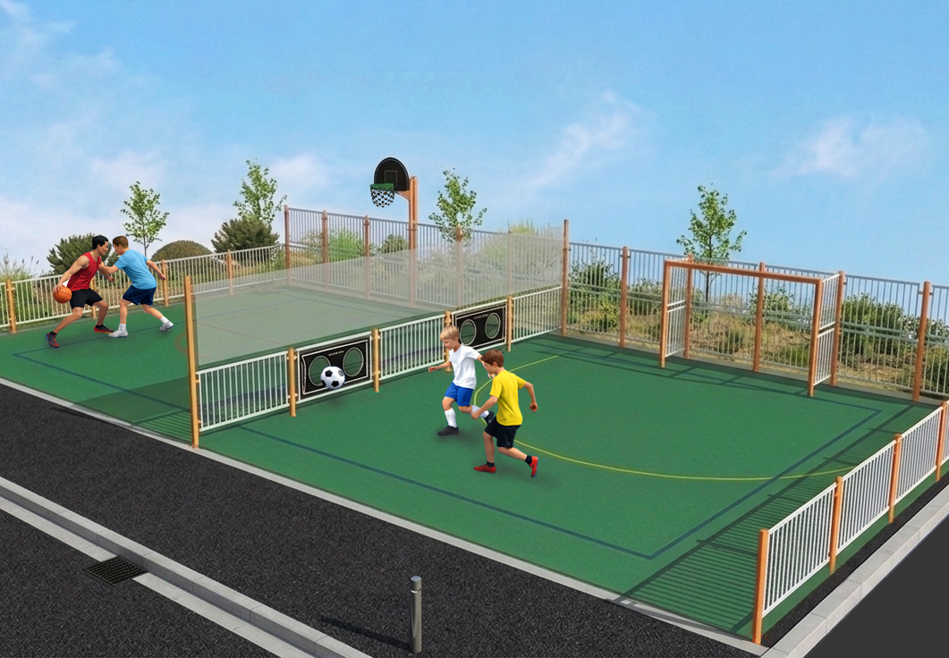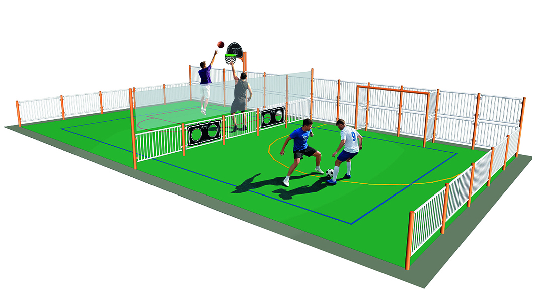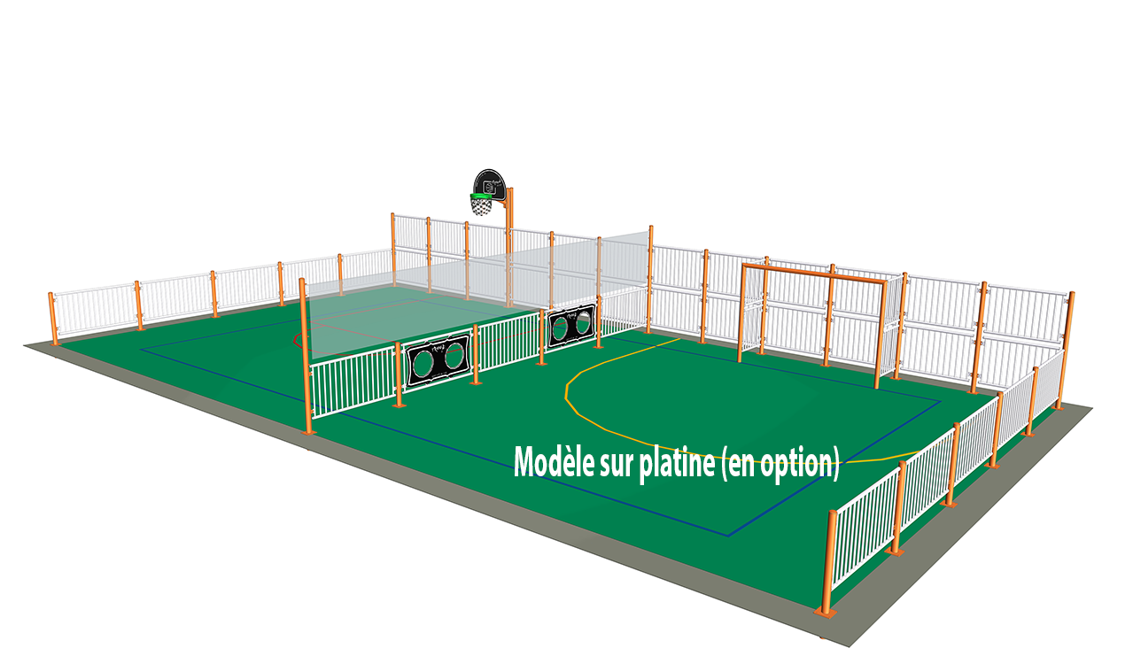 Issu de la gamme FREESPORT, ce demi-terrain double multisports s’adapte à tous les types de sites et s’intègre parfaitement aux espaces les plus restreints, afin de permettre la pratique de 5 sports dont 2 en simultané.
