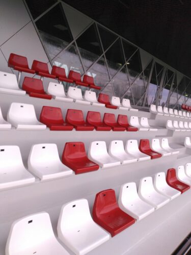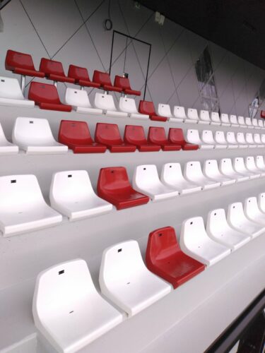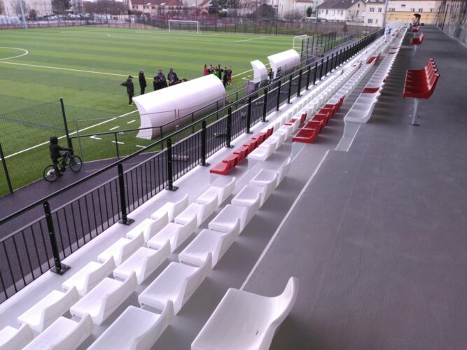 Une tribune emblématique, sublimée par nos assises noires et rouges, spécialement installées pour faire ressortir avec fierté le nom de TRAPPES.