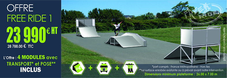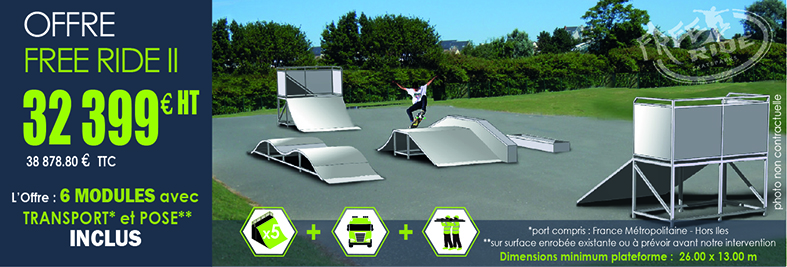 Profitez dès maintenant de notre promotion exclusive sur un espace skatepark complet, comprenant 4 modules avec niveaux de pratique différents L’offre inclut les modules, le transport ainsi que la pose sur site, pour une installation rapide et sécurisée. Attention : la réalisation de la plateforme (dalle béton ou enrobé) reste à votre charge et devra […]